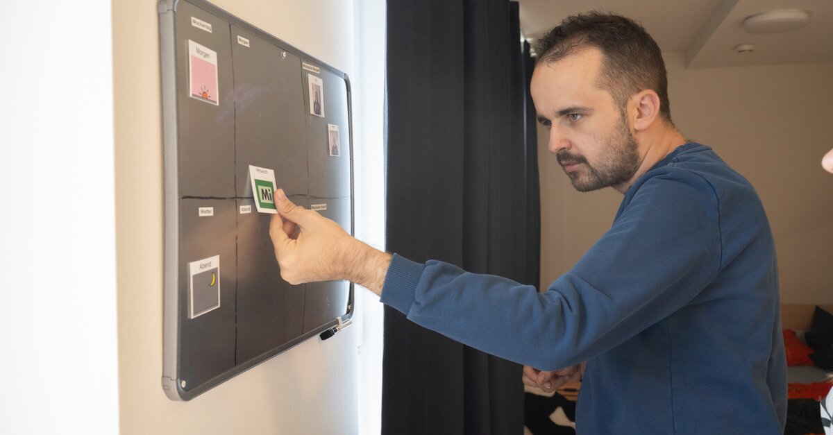 Gent ist sehr vielseitig im Alltag unterwegs. Damit er am Morgen weiss, was alles im Tagesstrukturangebot ist, bewirtschaftet er seine eigene so genannte «UKTafel », eine magnetische Tafel mit Piktogrammen, die als Unterstützung in der Kommunikation eingesetzt wird. Auf jedem Piktogramm ist jeweils ein Bild der Tätigkeit zu sehen. Diese ordnet er gemeinsam mit seiner Begleitperson Lia auf der UK-Tafel richtig an. Während dem Anordnen besprechen sie zusammen den Tag. So kann Gent mitbestimmen und mitteilen, auf was er sich freut.