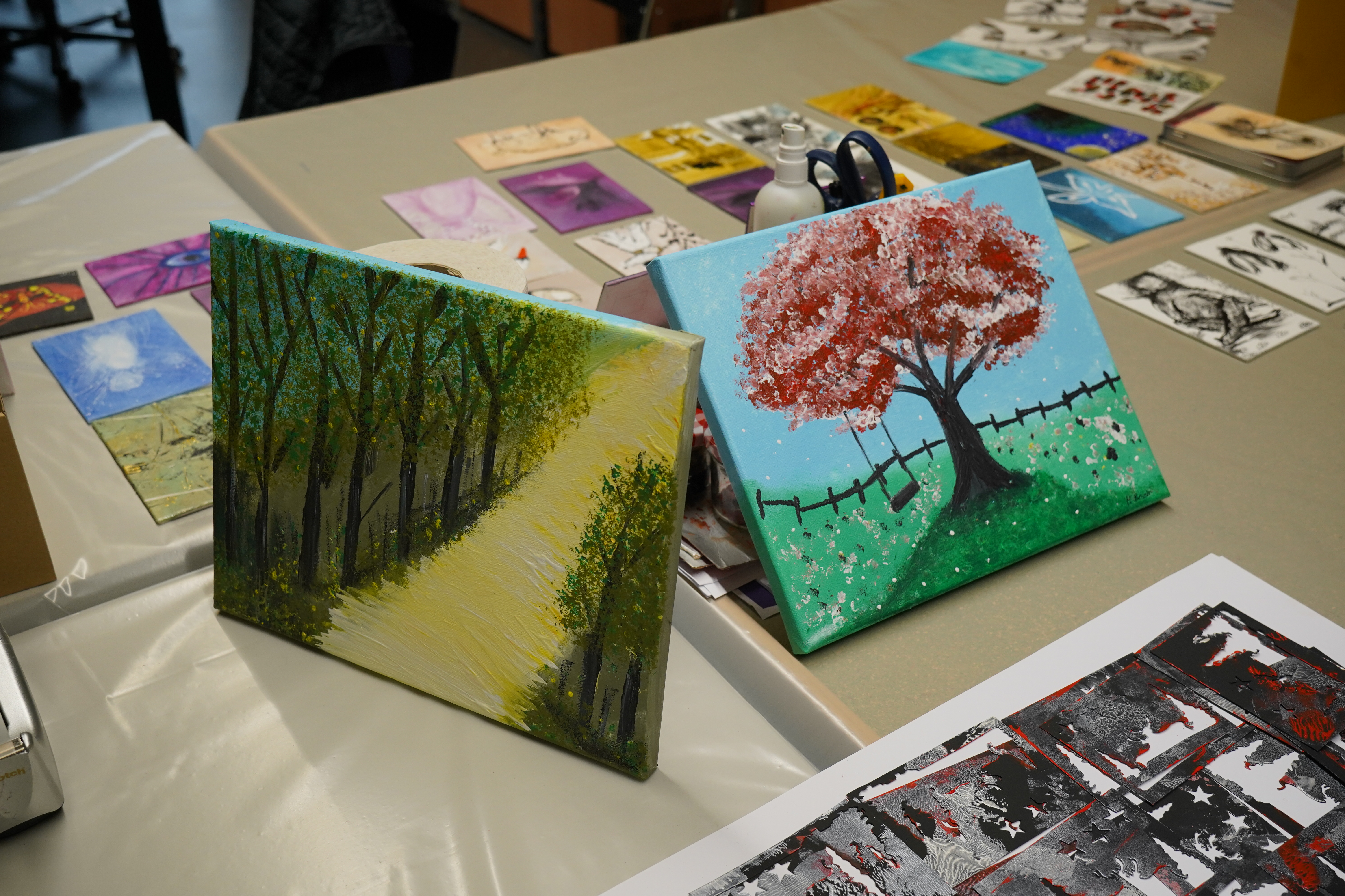 Im Atelier gilt: Alles ist erlaubt. Moni, die schon länger dabei ist und auch privat gerne malt, zeigt den anderen immer wieder neue Techniken. Gearbeitet wird mit Pinseln, Schablonen, verschiedenen Strukturen – oder ganz einfach mit den Händen. Dabei kommen bunte Farben, Stoffe, Blätter, Kordeln oder sogar Kaffee zum Einsatz. Auch Teamarbeit spielt eine wichtige Rolle: Die Mitarbeitenden unterstützen sich gegenseitig und geben sich Tipps. Sie erinnern einander auch daran, zwischendurch eine Pause einzulegen und am nächsten Tag mit frischem Blick weiterzumachen. Denn Emotionen und Gefühle in Bildern auszudrücken und zu verarbeiten, braucht Zeit und Energie. Dies spiegelt sich auch in der Arbeit mit dem Pinsel wider.